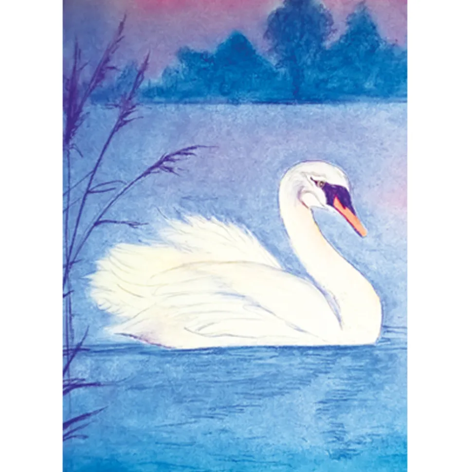 Gevouwen wenskaart met een witte envelop. Blanco binnenzijde. Handgetekende pentekening met aquarel van een zwaan.