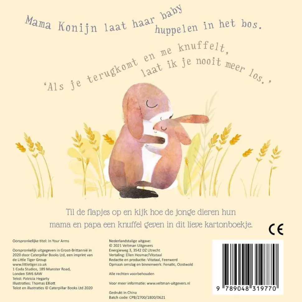Mama Konijn laat haar baby huppelen in het bos. ‘Als je terugkomt en me knuffelt, laat ik je nooit meer los.’ Til de flapjes op en kijk hoe de jonge dieren hun mama en papa een knuffel geven in dit lieve kartonboekje.