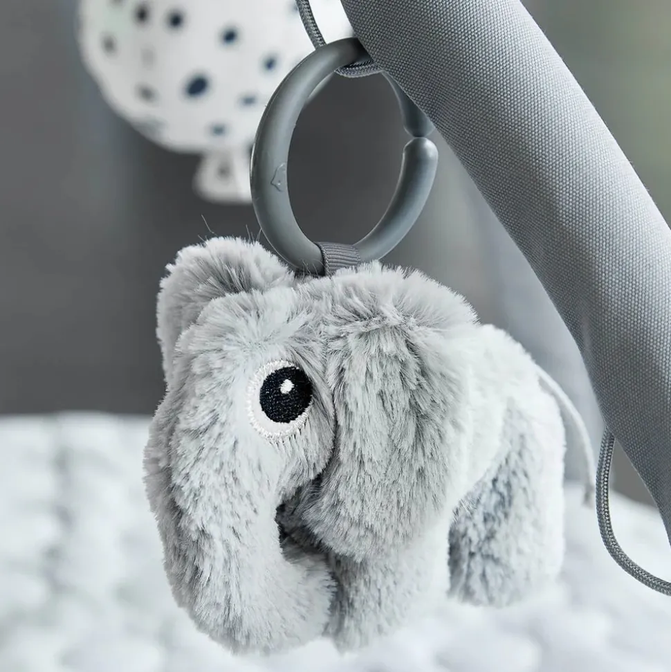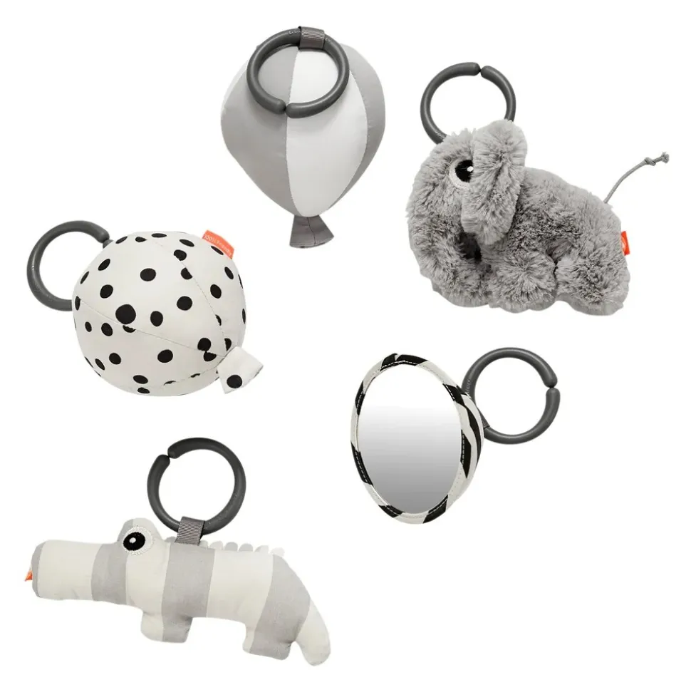 Hang het speelgoed in 13 verschillende standen aan de bogen. Croco knettert bij aanraking, Elphee rammelt, het spiegeltje glimlacht terug en de ballonnen bevatten gong en een bel – allemaal voor de stimulatie van je baby.
