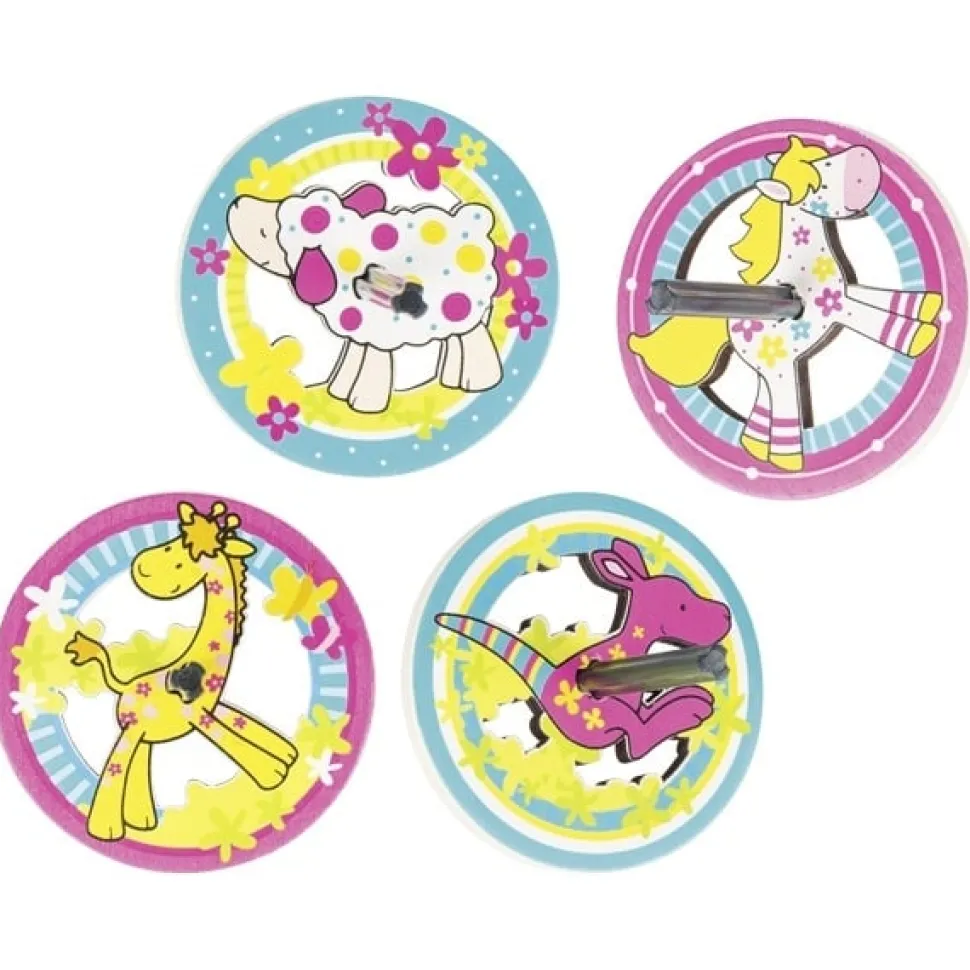 Draai deze houten tol eens rond en zie wat voor een leuk effect je krijgt met de verschillende dieren die er op afgebeeld staan! De tol wordt assorti geleverd. We proberen met jouw voorkeur rekening te houden. De diameter is 6 cm.