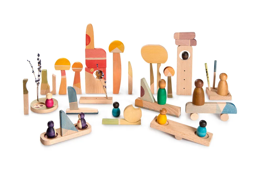 A set made up of 40 pieces to build your perfect happy place. The set allows children to navigate themselves through all their learning phases. It’s a great addition to storytelling and small worlds, all the way to stacking, fitting, colour-matching and… the sky’s the limit with open-ended play!
