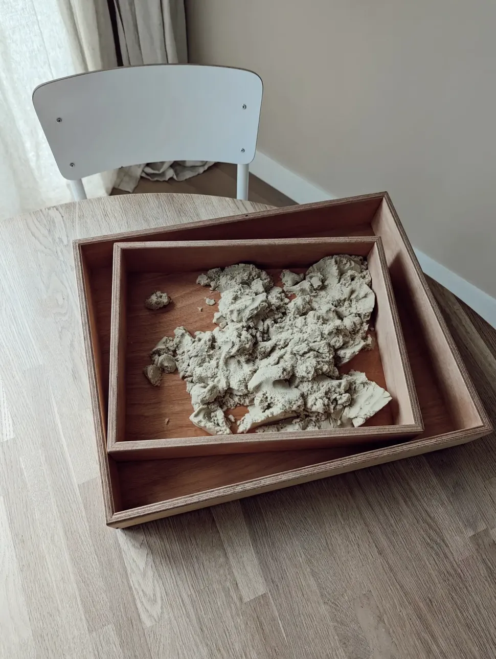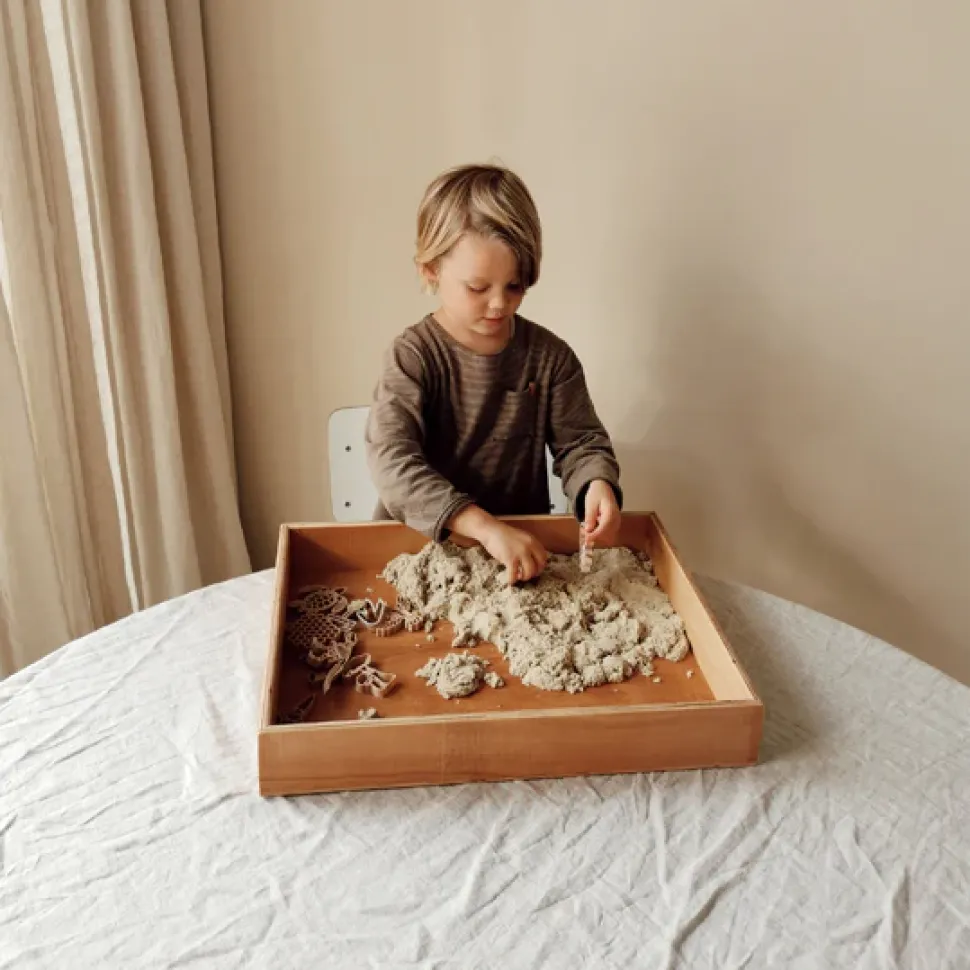 Deze houten speelbak is 40x50x7 cm groot.