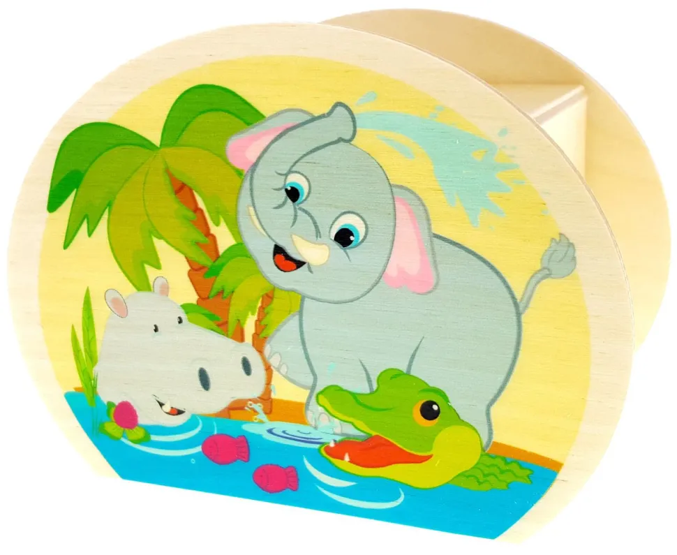 Een spaarpot die met de hand gemaakt is van hout. Deze spaarpot van Hess heeft aan beide zijden afbeeldingen van dieren die in de jungle voorkomen zoals een olifant, nijlpaard en krokodil. Leuk om te geven of te ontvangen.