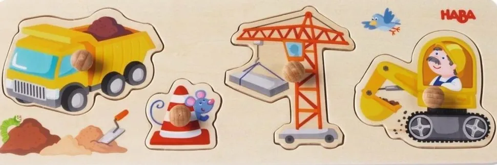 Op de werf is er altijd veel te doen. Wie wil de ijverige bouwvakkers helpen bij het werk? Bij deze inlegpuzzel kunnen de kleinsten stuk voor stuk de stevige houten delen met de grote, gemakkelijk te grijpen knoppen, in de puzzel leggen.