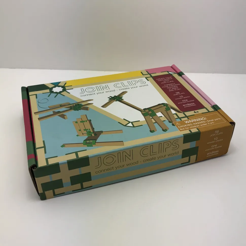 Dit is de mini set van JOIN CLIPS. Met deze basisset die bestaat uit slim gevormde verbindingselementen en houten plankjes kun je van alles maken; zoals vliegtuigen, dieren, figuren of boten.