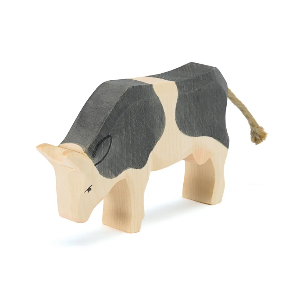 Deze zwart gevlekte koe van Ostheimer is lekker aan het grazen. Een leuke combinatie is samen met het drinkende kalf 11045. Hoogte: 9.5cm