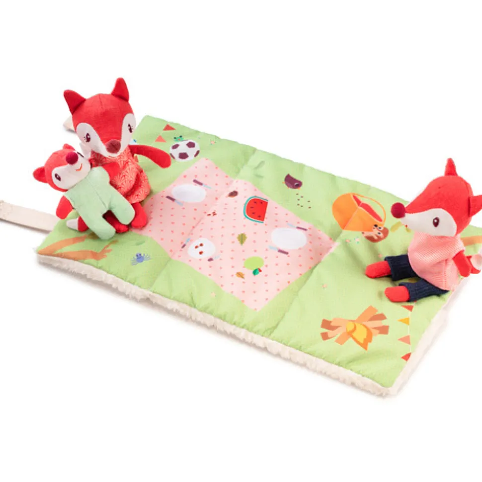 Wat een schattig vosjesgezin deze familie van Alice van Lilliputiens. Het matje en de figuurtjes kunnen gemakkelijk overal mee naar toe genomen worden. Zo kan de kleine telkens weer nieuwe avonturen beleven met deze speelset. De kleertjes van de poppetjes