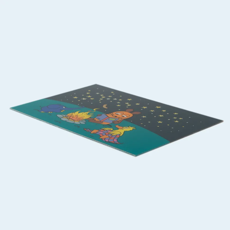 Een motief van de muis die voorleest bij een kampvuur, de olifant is een worstje aan het grillen. Dit motief is een acrylaat plaat die veilig is voor de kinderen doordat het veel steviger is dan glas. Dit motief past bij de rechthoekige lampen van Limundo
