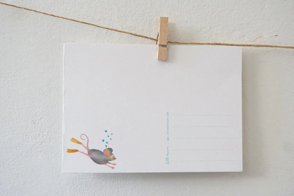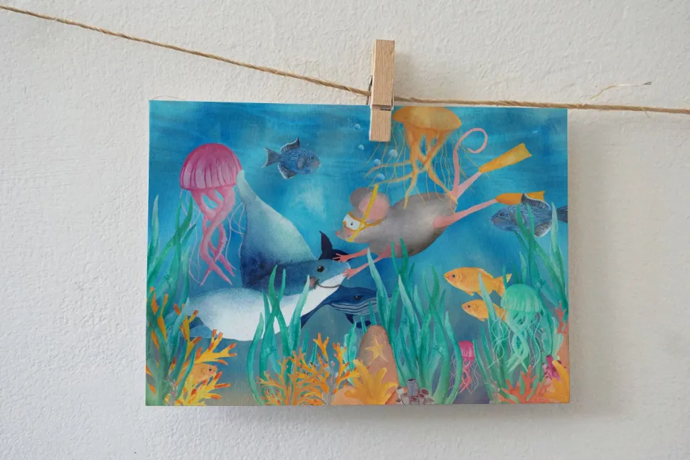Diep in de zee! Deze kaart komt uit de serie ‘ Puck de muis op avontuur in Europa’. Een zomerse illustratie die verstuurd kan worden als kaart, voor bij een cadeau of om de muur mee te versieren.