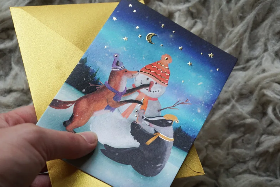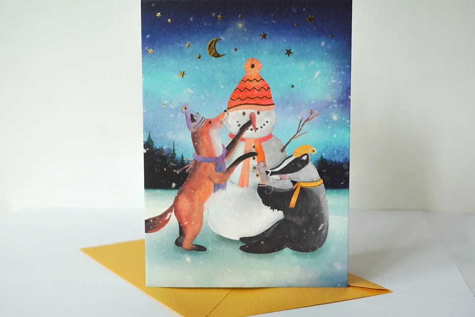 Lotte Drouen Wenskaart met Foliedruk Sneeuwpop Bouwen