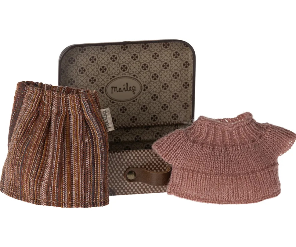 Verkleed oma muis met deze prachtige set kleding van Maileg. Het is verpakt in een kleine metalen koffer, waardoor je het gemakkelijk mee kunt nemen op vakantie.