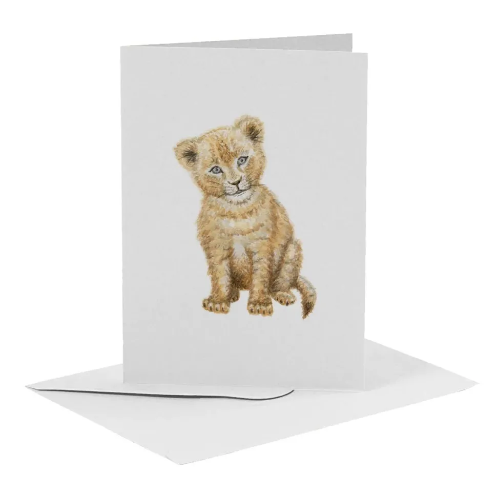Een blanco wenskaart zonder tekst waarop een leeuw is afgebeeld. De schildering is gemaakt door Mies met aquarelverf. De kaart is gevouwen op A6 formaat, gedrukt op 350 grams gebroken wit papier en wordt inclusief witte envelop geleverd.