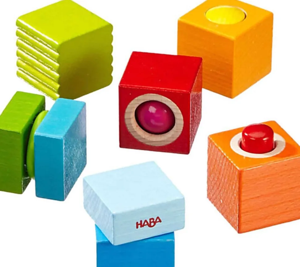 Spits je oren, want hier zijn heel veel verschillende geluiden te horen. Piepen, rammelen, bellen, ratelen… elk blok heeft een ander akoestisch effect in voorraad. Kleine klankenonderzoekers komen tijdens het spelen met de ontdekkingsstenen helemaal aan