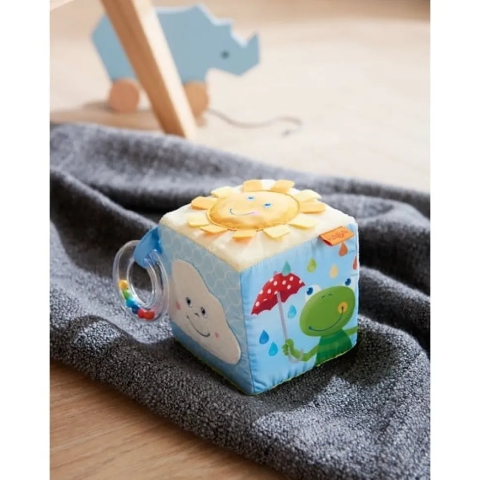 De zachte en kleurrijke speelkubus Regenboogwereld stimuleert de zintuigen op verschillende manieren: de leuke wolk fascineert met een boeiend knispereffect, in de grote spiegelfolie kunnen baby’s zichzelf ontdekken, binnenin piept de kubus en de bonte ra