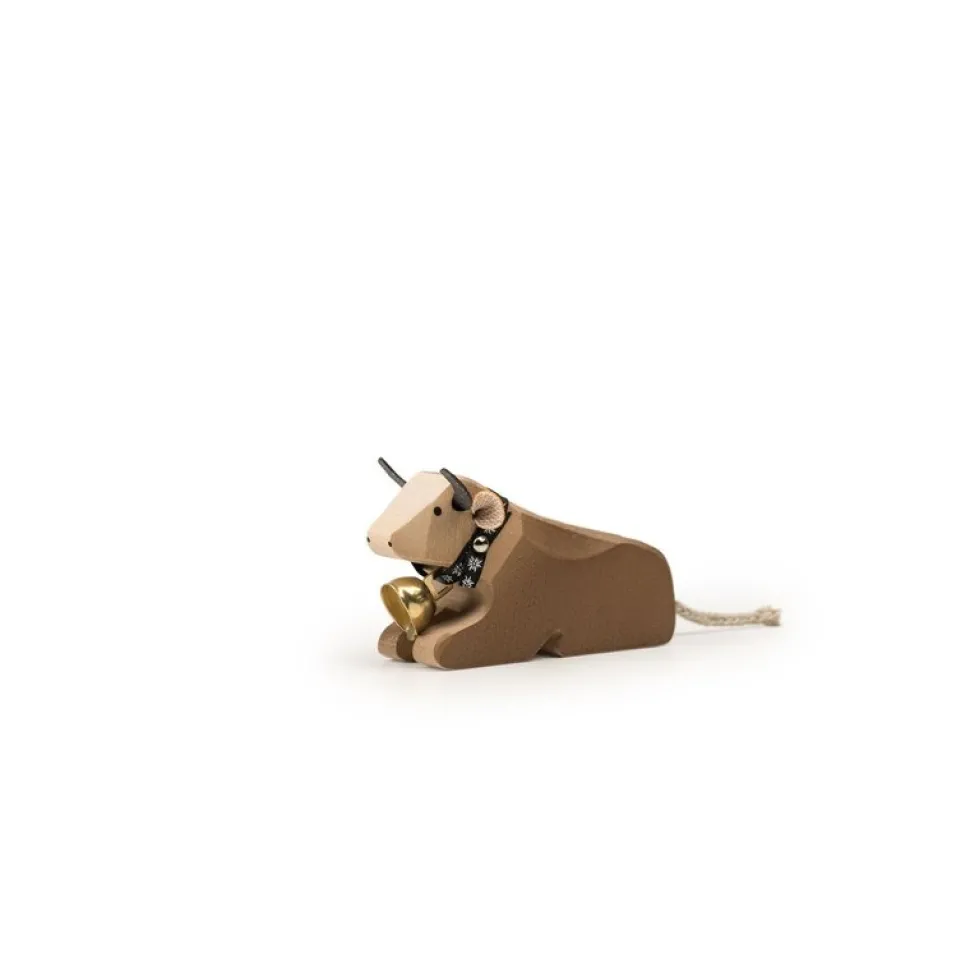 Deze bruine koe nummer 1 van Trauffer ligt en heeft zijn kop omhoog gericht. De koe is 10x5x3 cm groot. Deze bruinvee koe is handgemaakt in Zwitserland.