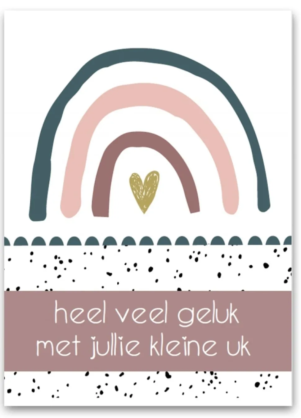 Specificaties voor: Wenskaart Heel veel geluk met jullie kleine uk (regenboog roze)