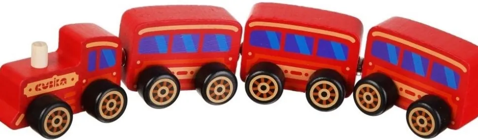 De houten trein bestaat uit 3 wagons en 1 locomotief. De trein past niet op rails maar kan eenvoudig zelf rijden over de weg.