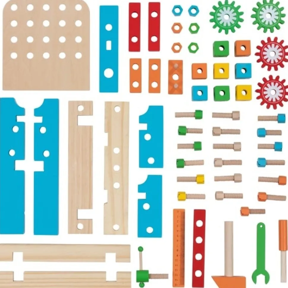 Deze houten werkbank is goed uitgerust: met gereedschap zoals een hamer, een moersleutel en een schroevendraaier, er kunnen vormen worden gezet samen en weer uit elkaar gehaald, werkstukken kunnen worden vastgeklemd en onderdelen gemeten.