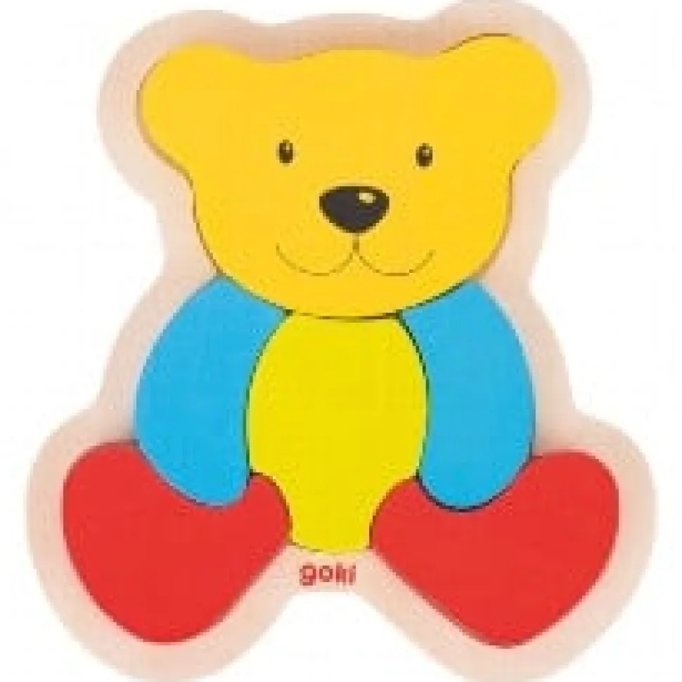 Leg de 6 stukjes van deze inlegpuzzel beer van Goki in de juiste volgorde en dan zie je een bont gekleurde beer te voorschijn komen.