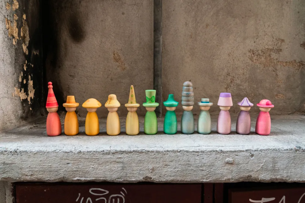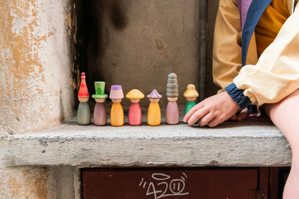 Deze set van Grapat bevat 12 Nins met de hand gekleurd in 12 kenmerkende kleuren van de regenboog met verwisselbare hoeden en lichamen om nog meer combinaties van kleurrijke mogelijkheden te bieden voor elke spelactiviteit met een open einde.