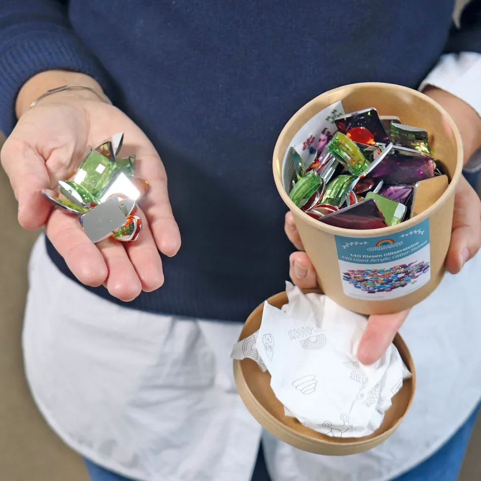 Deze set met grote glitterstenen bestaat uit 140 grote uit acryl gemaakte stenen. De onderkant van de steen is voorzien van een spiegelende laag voor nog meer glittereffect. De stenen hebben een diameter tussen 2.5 en 4.5 cm.