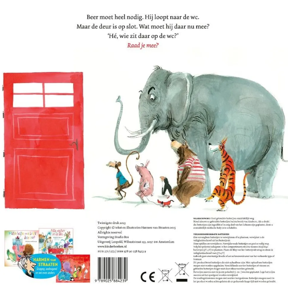 Raad je mee? Beer en zijn vrienden moeten heel lang wachten voordat de deur van de wc eindelijk opengaat… Favoriet van kinderen, voorleesouders, juffen en meesters. Ga jij ook al op de grote wc? Een leuk boek voor de zindelijkheidstraining. En nog steeds een voorleessucces daarna. Van Harmen van Straaten, grappig, ondeugend en net even anders.