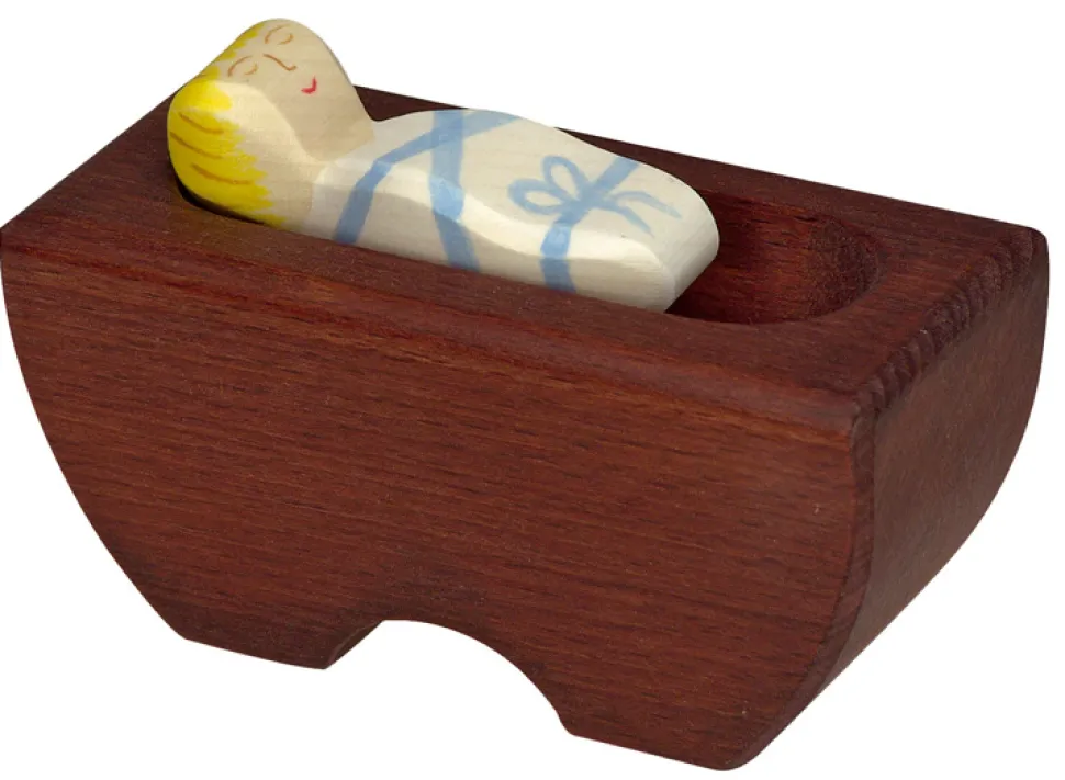 Dit is Kindje Jezus in de kribbe, uit hout gesneden figuur van Holztiger. Tezamen met de overige figuren kun je zo een mooie houten kerststal maken.Kindje Jezus past goed bij de andere Kerstfiguren uit serie II. Afmeting: 11×2.8×8 cm