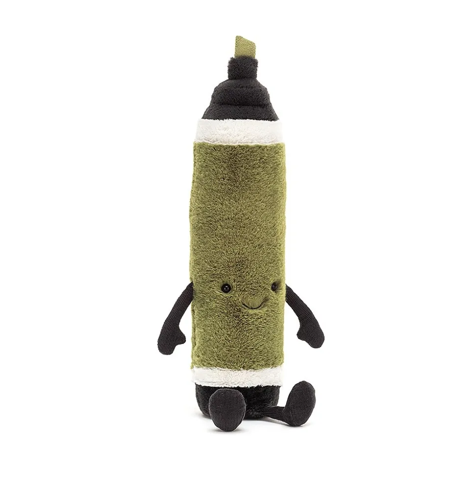Stationery Marker Pen van Jellycat is graag het middelpunt op je bureau. Met een mosgroene vacht, zwarte corduroy pootjes en armpjes komt deze markeerstift je graag helpen.