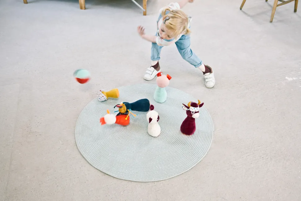 Gooi ze allemaal in een keer om! Dit klassieke kegelspel met knuffeldieren van de boerderij is ideaal om binnen te spelen en goed voor de oog-hand coördinatie en het balgevoel. Inclusief doorzichtige met rits afsluitbare opbergtas.