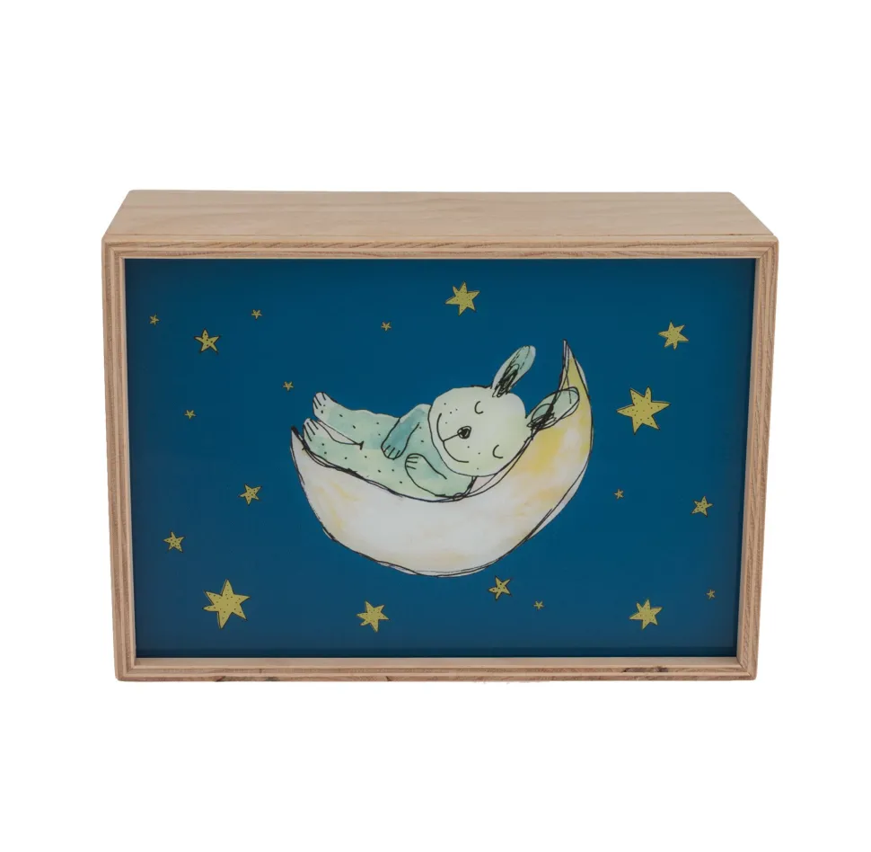 Een mooie rechthoekige houten wandlamp van Limundo. Uniek aan deze wandlamp is het verwisselbare front. Deze heeft een motief waarop Sophia de muis aan het slapen is op de maan. Wandmontage of losstaand is beide mogelijk.