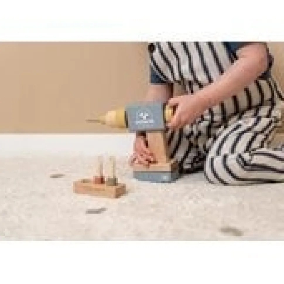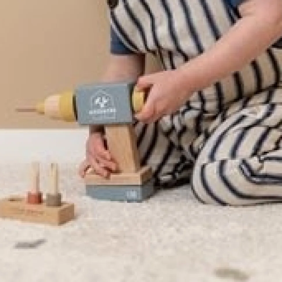 Boor, schroef en draai! Met deze houten speelgoedboor kun je bijna alles repareren. Wat wordt je eerste klusproject? Kies een van de drie verwisselbare bitjes, bevestig deze in de kop van de boor en ga aan de slag.