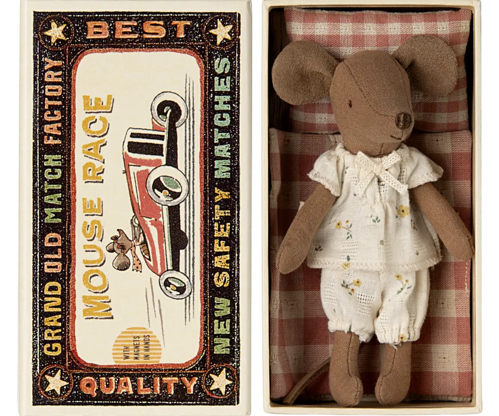 Een klassiek Maileg-item. Deze muis is klaar voor uren speelplezier en slaapt lekker weg in het kleine luciferdoosje. De kleding en het beddengoed zijn gemaakt van zachte stoffen met unieke prints in prachtige kleuren.