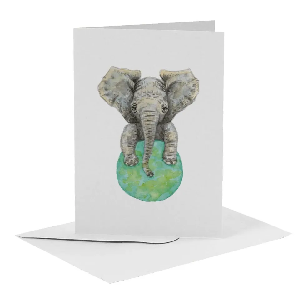 Een blanco wenskaart zonder tekst waarop een olifant is afgebeeld. De schildering is gemaakt door Mies met aquarelverf. De kaart is gevouwen op A6 formaat, gedrukt op 350 grams gebroken wit papier en wordt inclusief witte envelop geleverd.