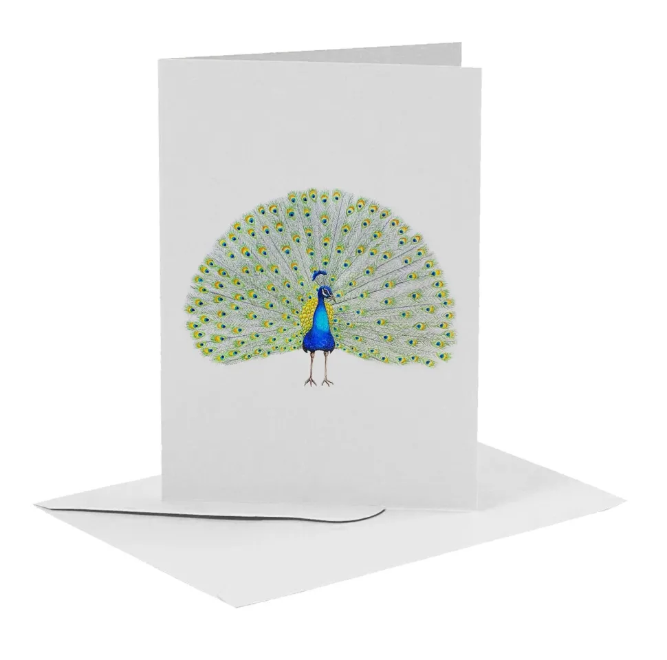 Een blanco wenskaart zonder tekst waarop een pauw is afgebeeld. De schildering is gemaakt door Mies met aquarelverf. De kaart is gevouwen op A6 formaat, gedrukt op 350 grams gebroken wit papier en wordt inclusief witte envelop geleverd.