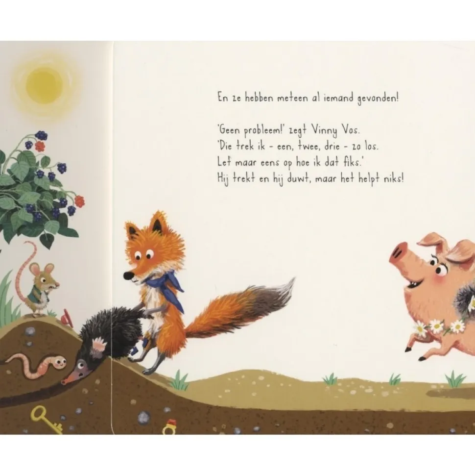 Eén voor één doen de dieren een poging hem te bevrijden. Maar in hun eentje lukt het niet. En als ze nu een lange rij maken, en allemaal tegelijk trekken, zou Mol dan eindelijk los schieten?