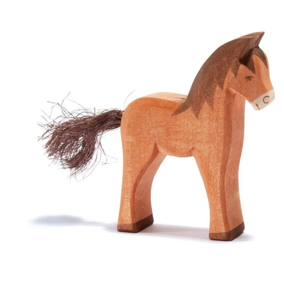 Dit bruine veulen van Ostheimer staat rechtop en is met dehand vanhout gemaakt en beschilderd. Hoogte: 9.7 cm