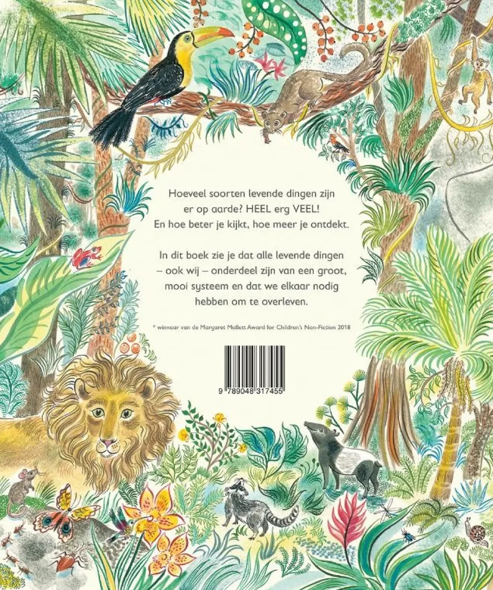 Hoeveel soorten levende dingen zijn er op aarde? HEEL erg VEEL! En hoe beter je kijkt, hoe meer je ontdekt. In dit boek zie je dat alle levende dingen – ook wij – onderdeel zijn van een groot, mooi systeem en dat we elkaar nodig hebben om te overleven. *w