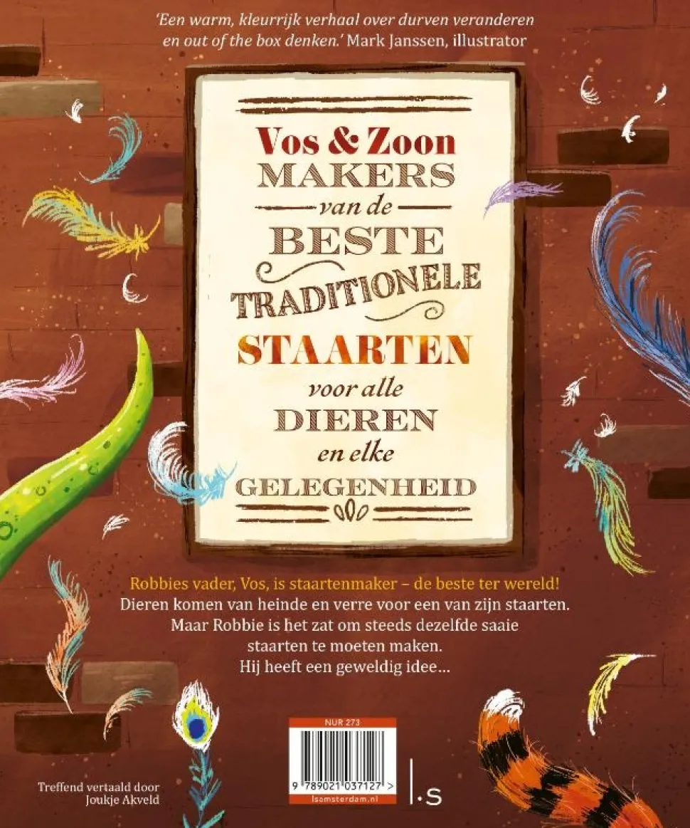 Robbie helpt zijn vader Vos in zijn winkel. Vos is de beste staartenmaker ter wereld. Allerlei dieren komen naar zijn winkel om de mooiste staarten te laten maken. Er zijn staarten voor bruiloften, voor verjaardagen en zelfs voor de eerste schooldag. Robbie meet de klanten op voor de perfecte staart. En dat is niet altijd makkelijk! Maar Robbie heeft er schoon genoeg van om dag in, dag uit dezelfde soort staarten te maken. Hij heeft een geweldig idee… ‘Wat een geweldig prentenboek van Paddy Donnelly! Het is een warm en kleurrijk verhaal over durven veranderen en out of the box denken.’ Mark Janssen, illustrator