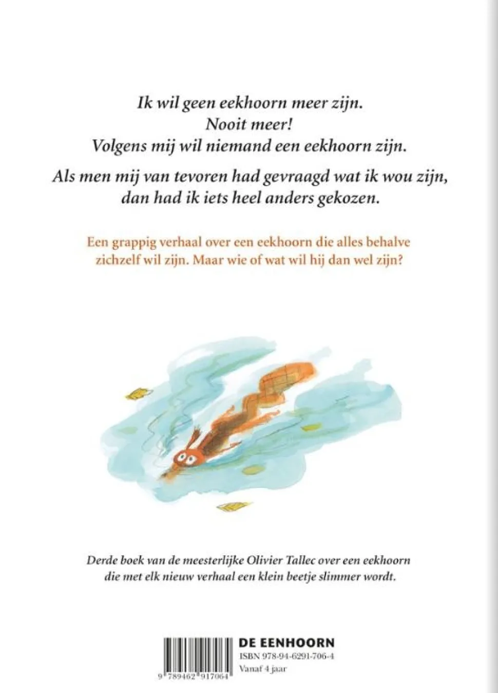 » Derde, zelfstandig leesbare prentenboek uit de grappige, succesvolle Eekhoorn-reeks. Is het leven van andere dieren veel rooskleuriger dan dat van Eekhoorn? Eekhoorn wil geen eekhoorn meer zijn. Hij zou veel liever een bever zijn, want bevers werken samen om een mooie wereld te bouwen. Maar al dat werk komt hem niet zo goed uit. Eigenlijk was hij toch liever een hert geweest, met een prachtig gewei. Dan moet hij zich wel vaak verstoppen … Een egel dan, of een kikker, of een vleermuis? Of misschien is een eekhoorn zijn toch niet zo slecht?
